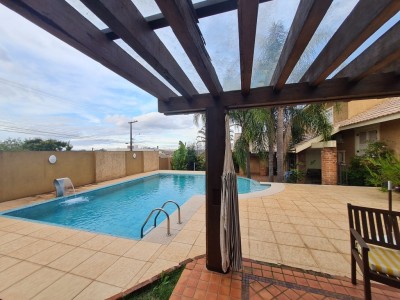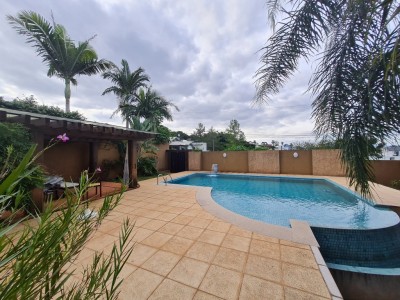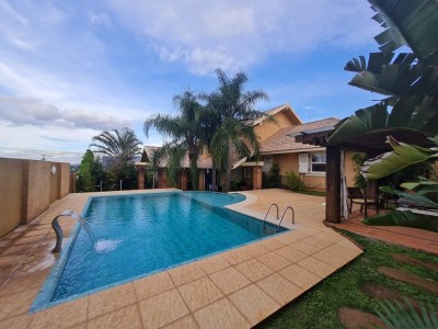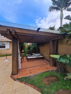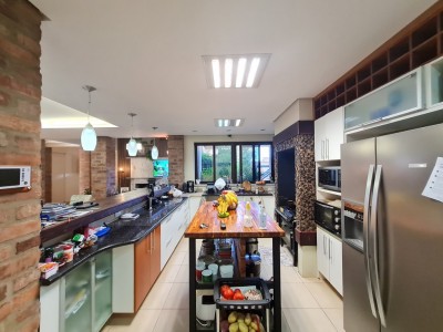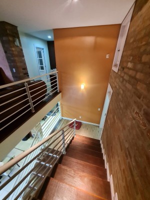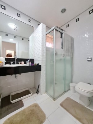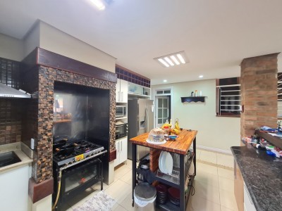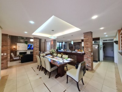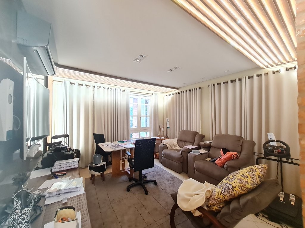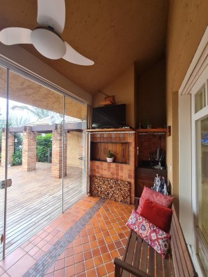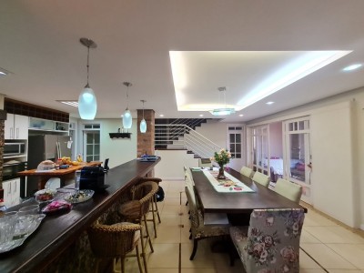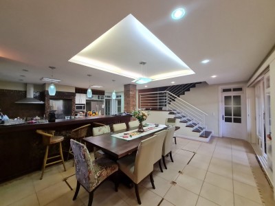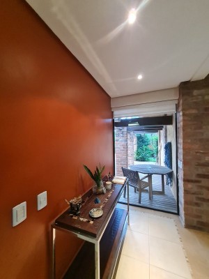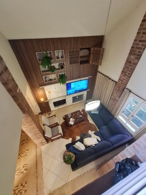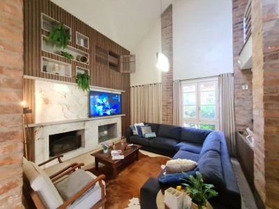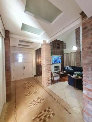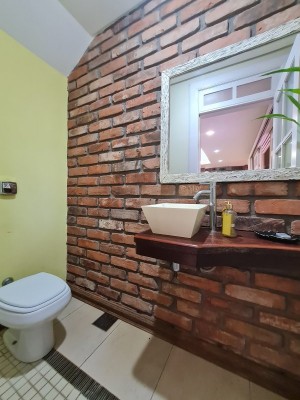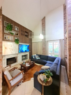 Descrição › Casa de esquina em estilo rustico, com detalhes em tijolo aparente, pé direito duplo, semi-mobiliada (permanecem moveis planejados, splits, iluminação e cortinas)