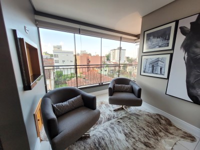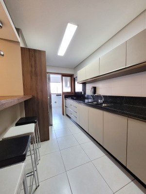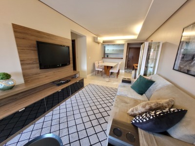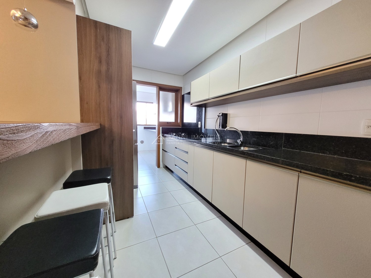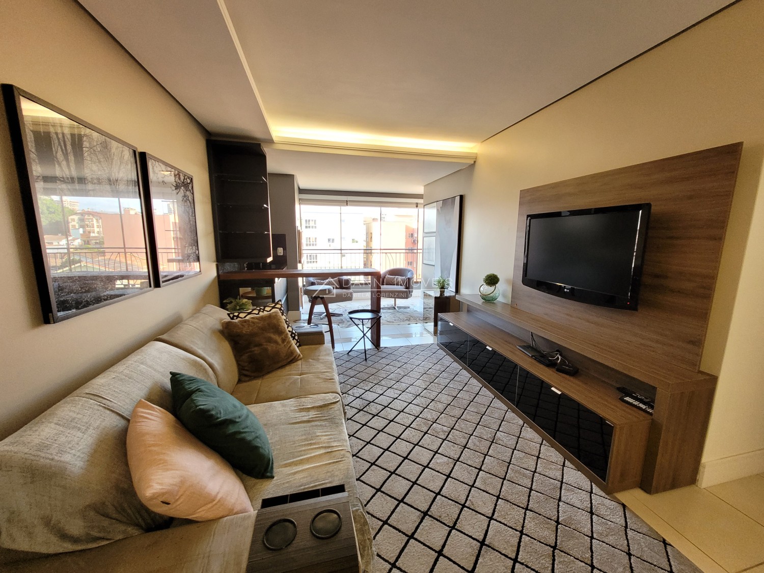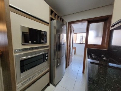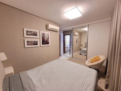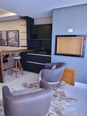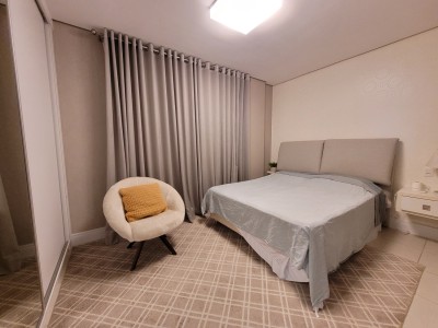 Descrição › Apartamento de frente com sol da manhã, sacada fechada com vidro, permanecem todos os moveis, eletros, cortinas, splits, tapetes e iluminação.