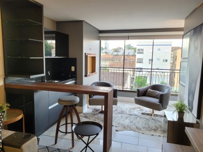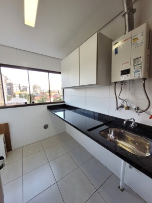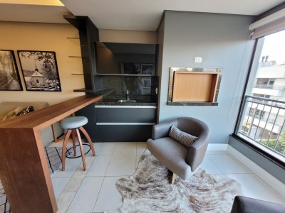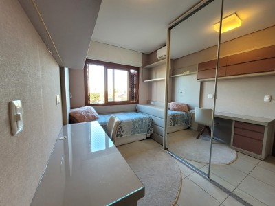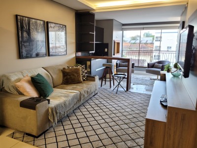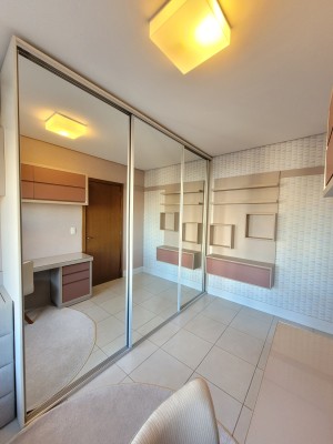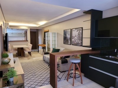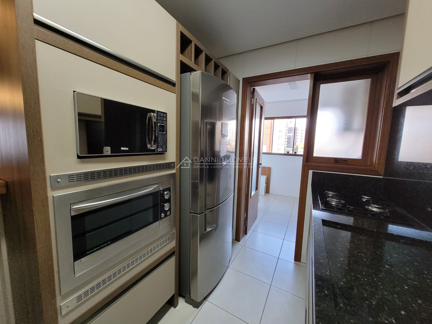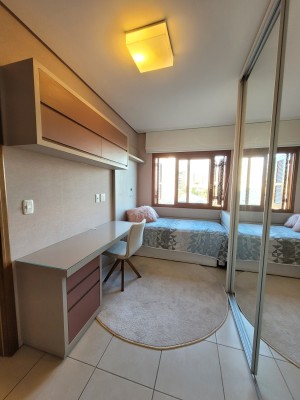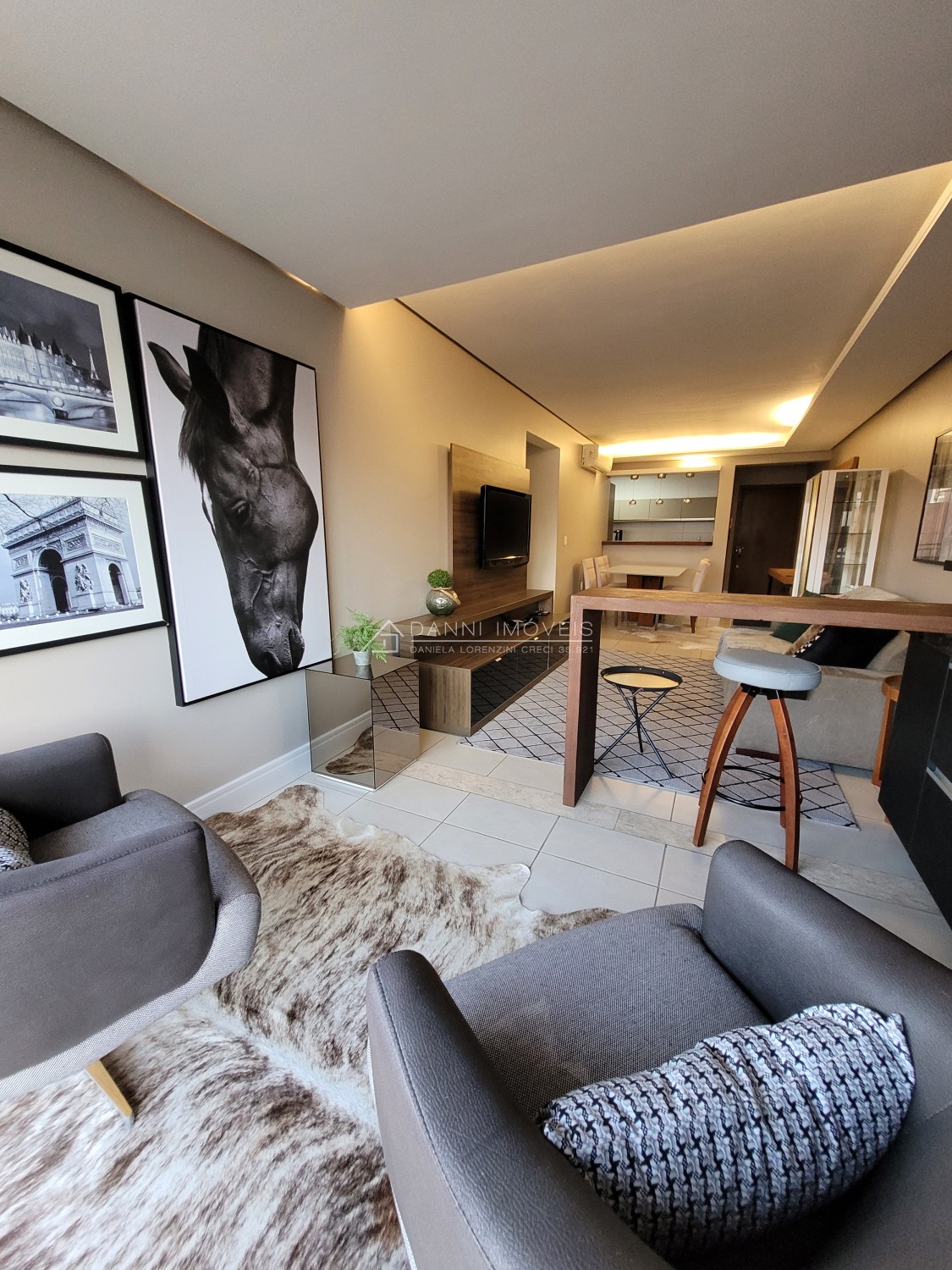 Descrição › Apartamento de frente com sol da manhã, sacada fechada com vidro, permanecem todos os moveis, eletros, cortinas, splits, tapetes e iluminação.