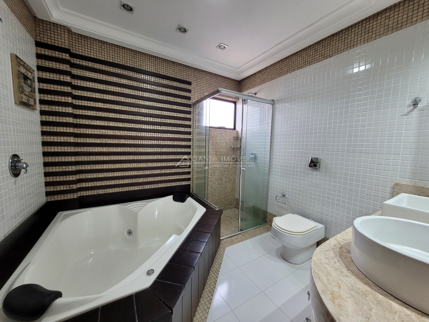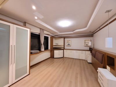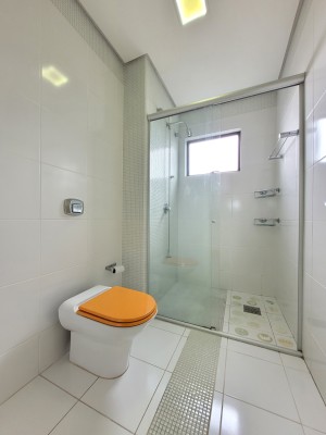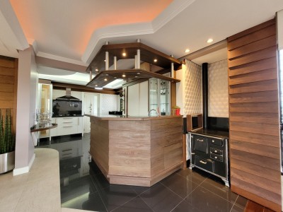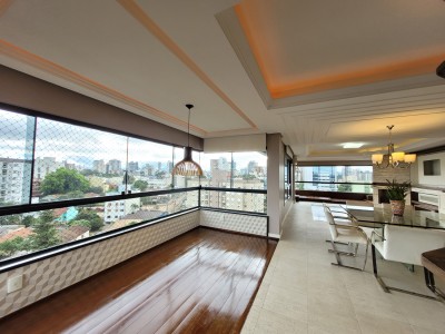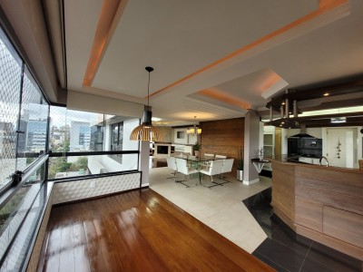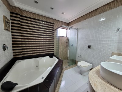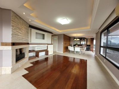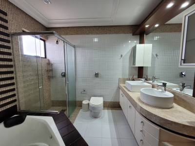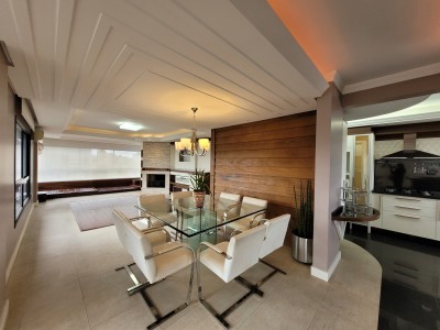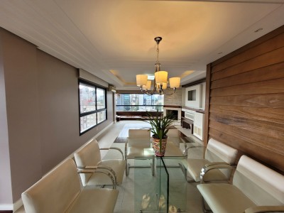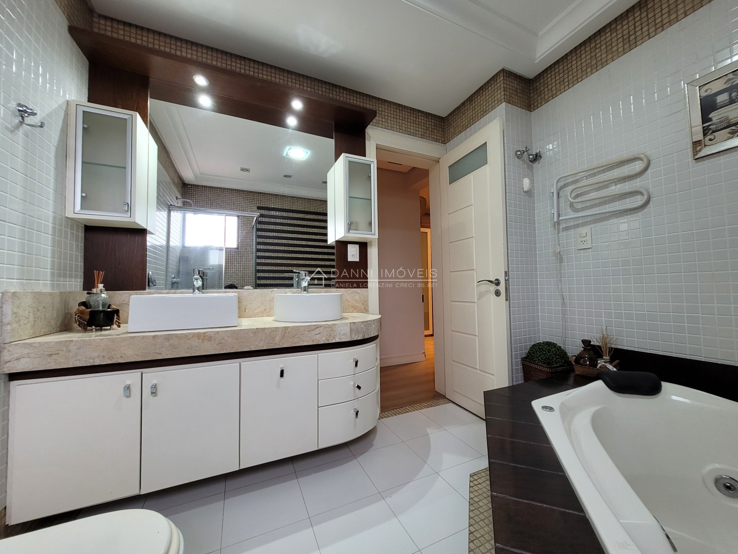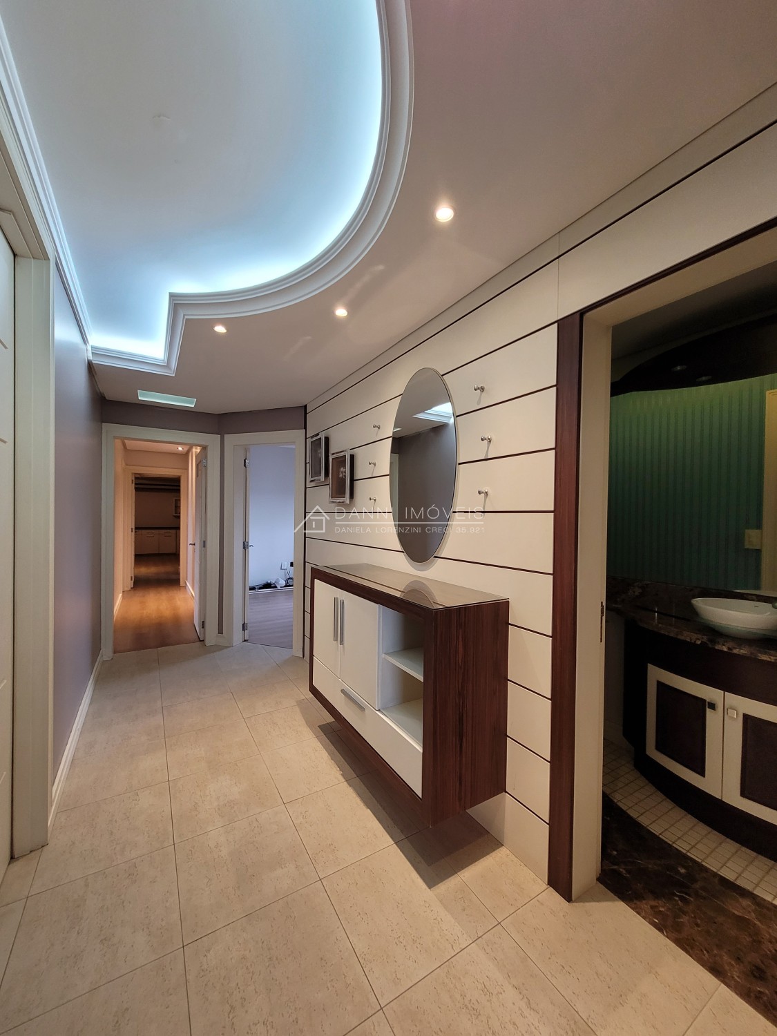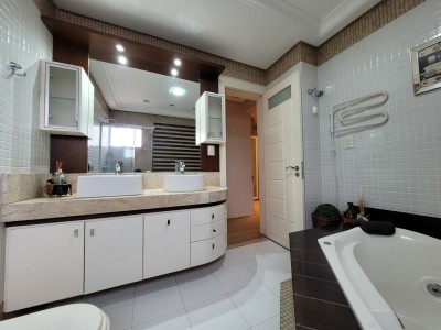 Descrição › Apartamento de 1 por andar, mobiliado! São 2 suítes americanas, 1 suíte master com closet e banheiro privativo com banheira de hidromassagem e mais 1 dormitório que pode ser utilizado com escritório. Lavabo, e banheiro social com chuveiro junto da lavanderia. Possui lareira e fogão a lenha.