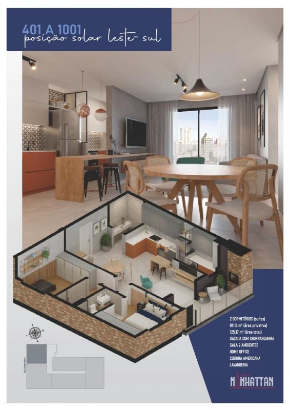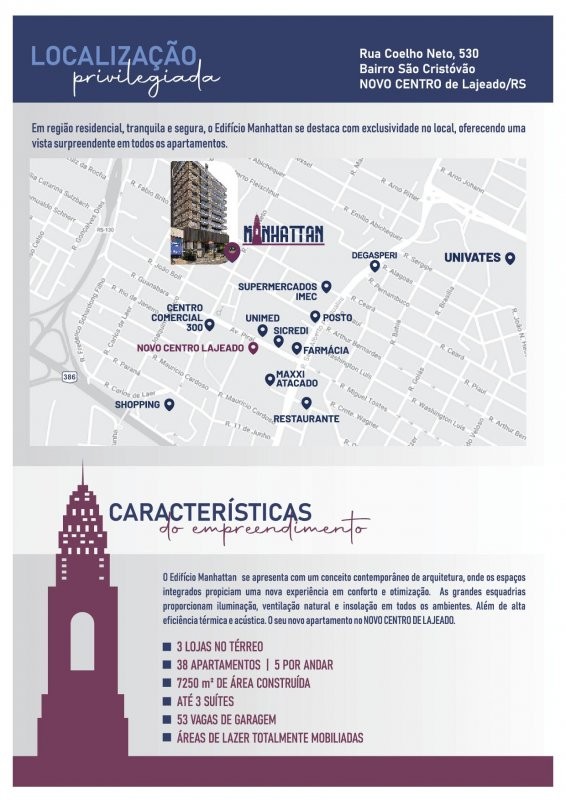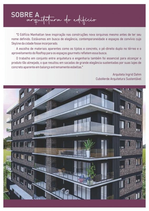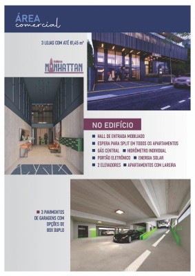 Descrição › O Edificio MANHATTAN se apresenta com um conceito contemporâneo de arquitetura, onde os espaços integrados propiciam uma nova experiência em conforto e otimização. As grandes esquadrias proporcionam iluminação, ventilação natural e insolação em todos os ambientes, além de alta eficiência térmica e acústica.