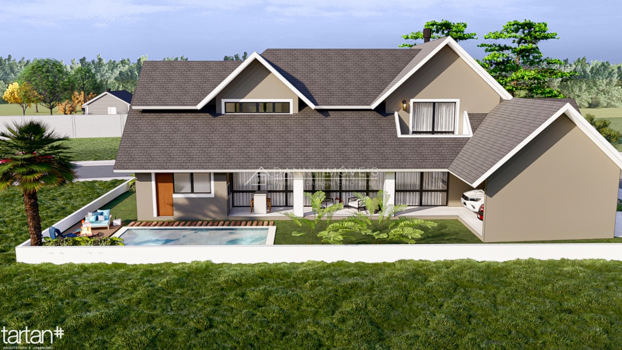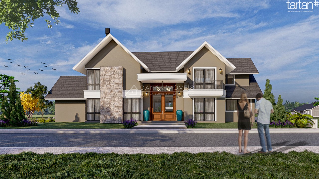 Descrição › Casa de esquina com 349,29 m² + piscina com 21,00 m², totalizando 370,29 m². Terreno com localização privilegiada, próximo de área verde e infraestrutura do condomínio, com 672,10 m² privativos. Hall com pé direito duplo. Cozinha, jantar, estar com lareira, lavabo, estúdio com banheiro privativo (possibilidade de se transformar em suíte).