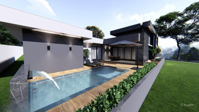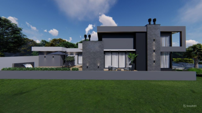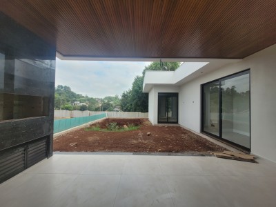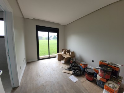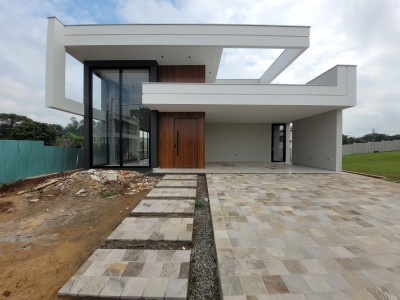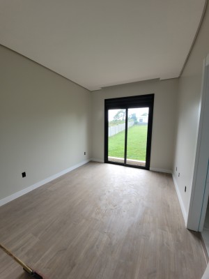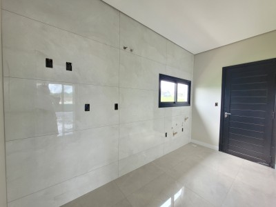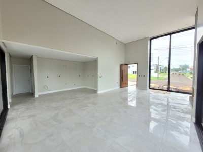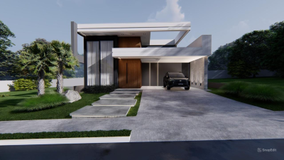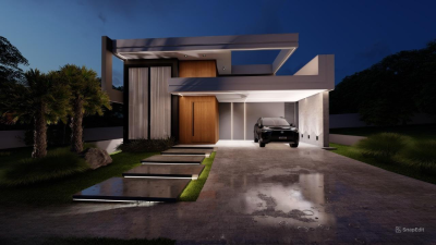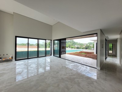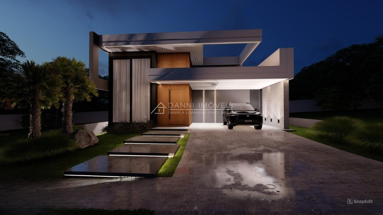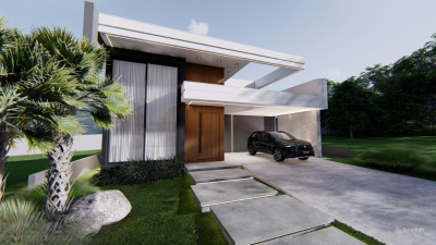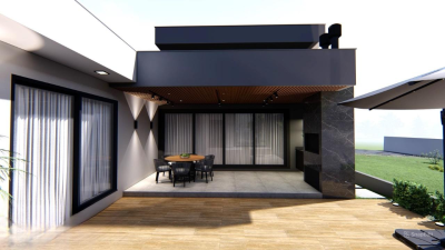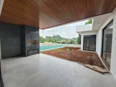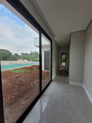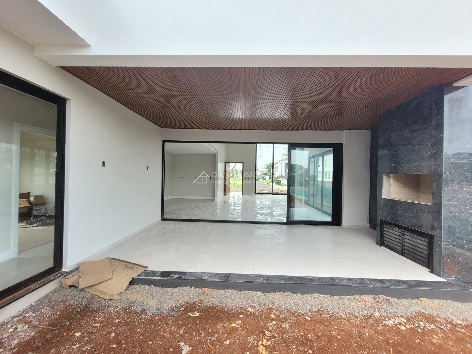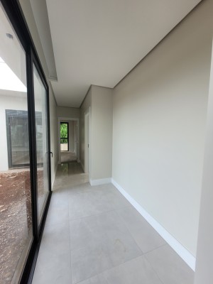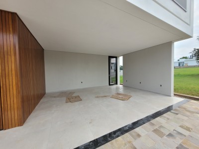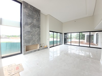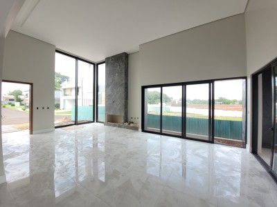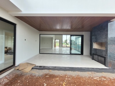 Descrição › Casa moderna e plana, com 207,60m m2, Aberturas Externas em Alumínio e Vidro, Portas internas em laca branca, 3 Suítes, Closet, Espaço Gourmet, Banheiro social, Lavabo, Depósito, Varanda e lavanderia, Porcelanato, Lareira, Churrasqueira, Sala com pé direito alto, Garagem para 2 carros, Pátio na frente, lateral e fundos, Espera para água quente, espera para split, Gás central, com Piscina e decks