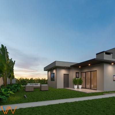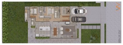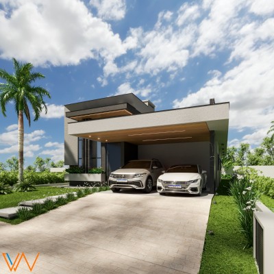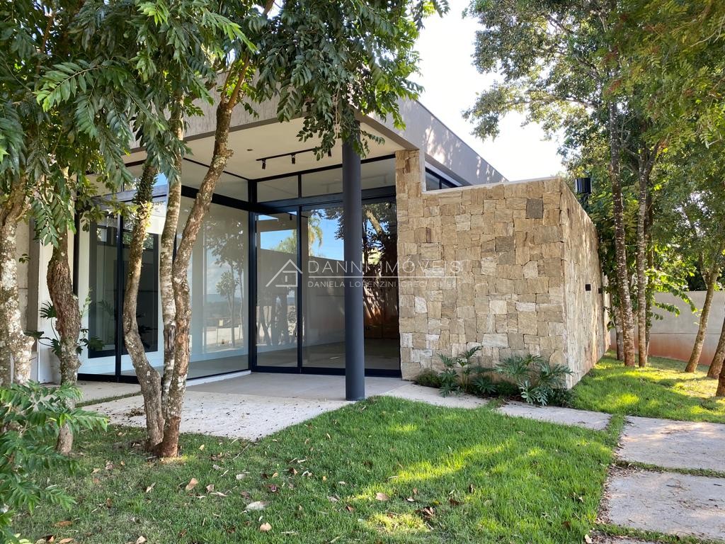 Descrição › Residência Cartier, 3 dormitório, sendo 1 suíte individual e 2 suítes americanas, Lareira e churrasqueira, Lavabo, Lavanderia, Iluminação externa, Jardinagem, Esquadrias alumínio alto padrão, Porcelanato Classe AAA, Laminado área íntima, Sala estar pé direito duplo, Rebaixo em gesso interno, Forro externo amadeirado, Acabamento interno em massa corrida, Espera água quente, Espera para energia solar, Espera para piscina, Garagem coberta para 2 veículos, Finalização de obra AGOSTO/2025.