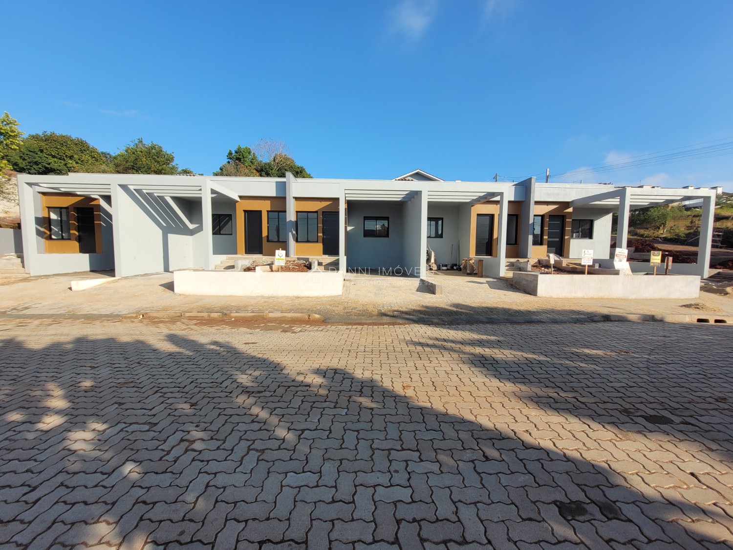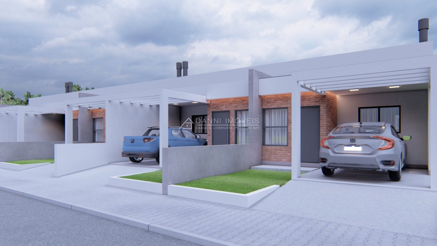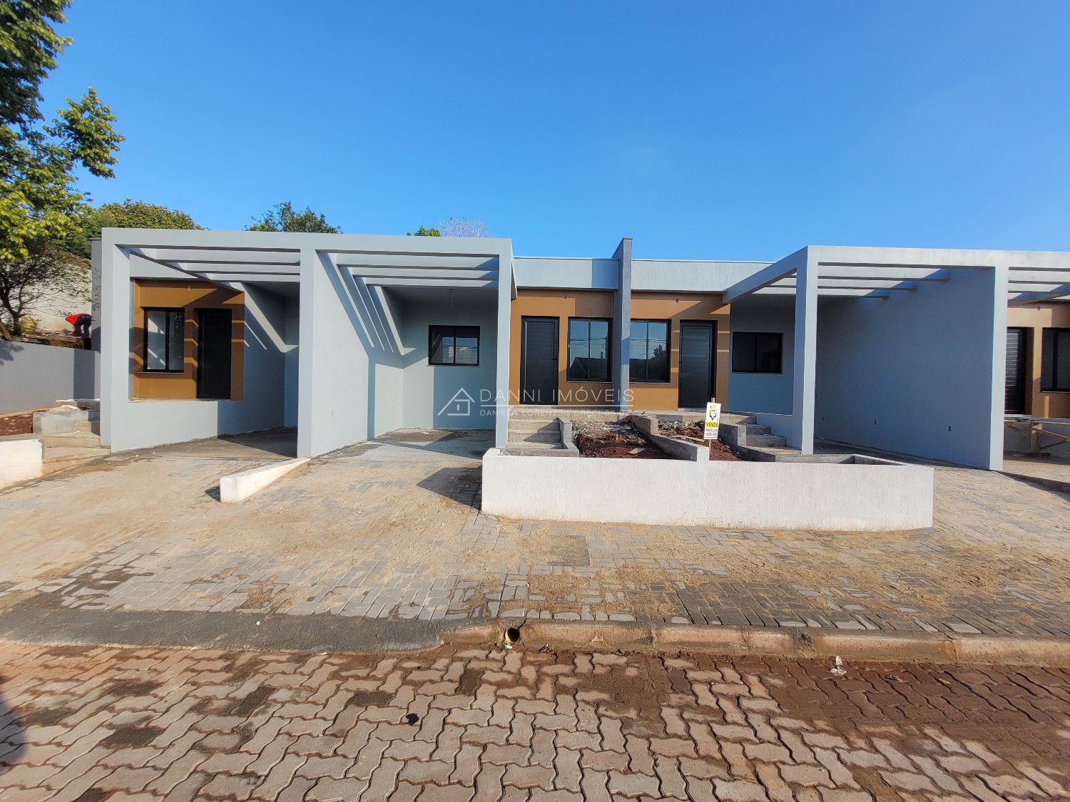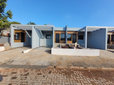 Descrição › Conjunto de casas geminadas com 2 dormitórios, banheiro social, churrasqueira e pequeno pátio. Vaga de estacionamento com peergolado.