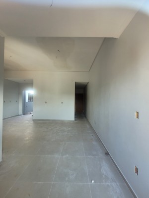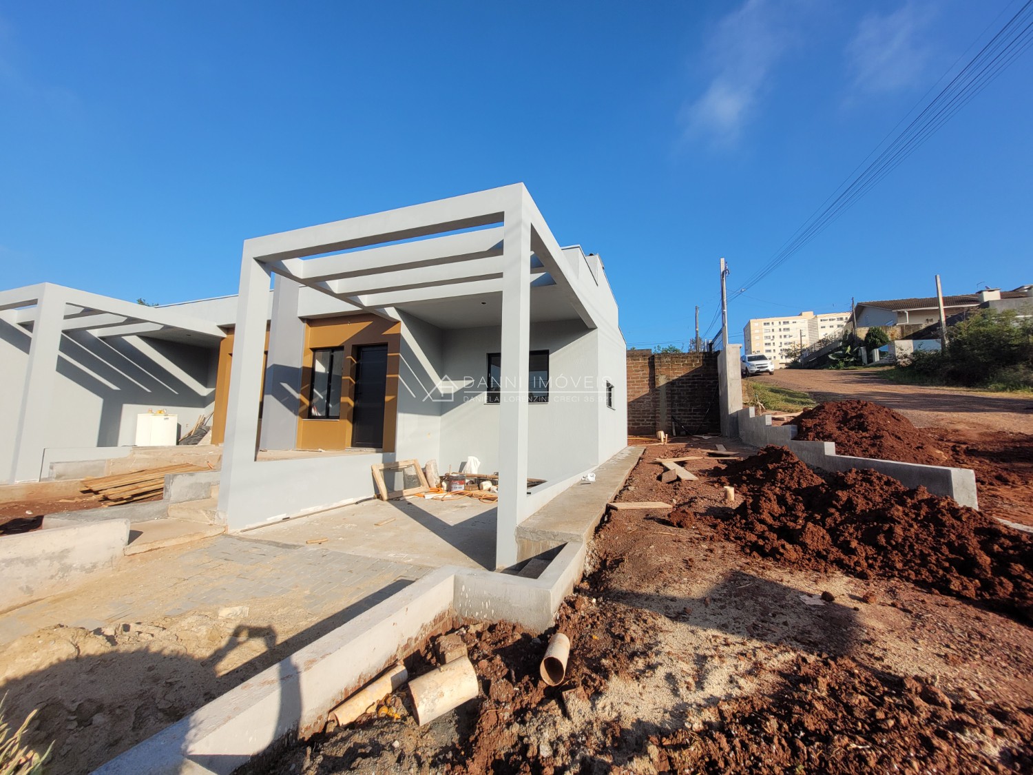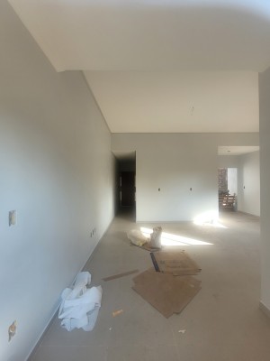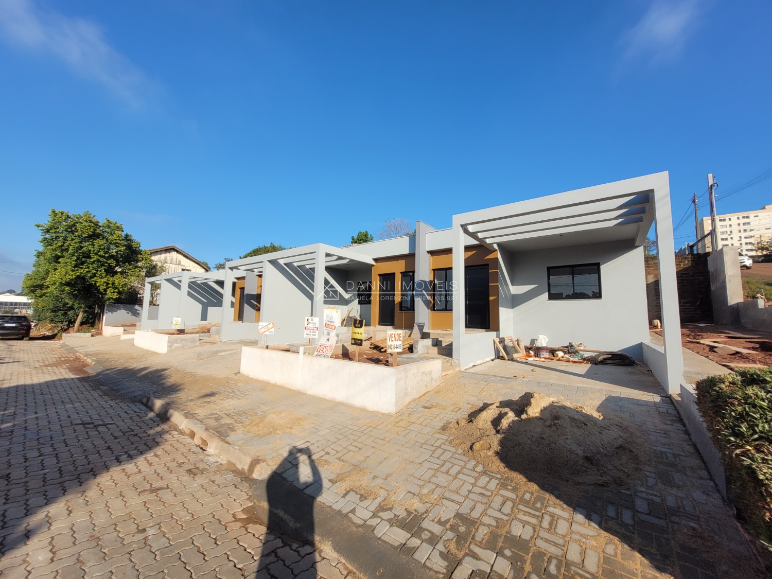 Descrição › Conjunto de casas geminadas com 2 dormitórios, banheiro social, churrasqueira e pequeno pátio. Vaga de estacionamento com peergolado.