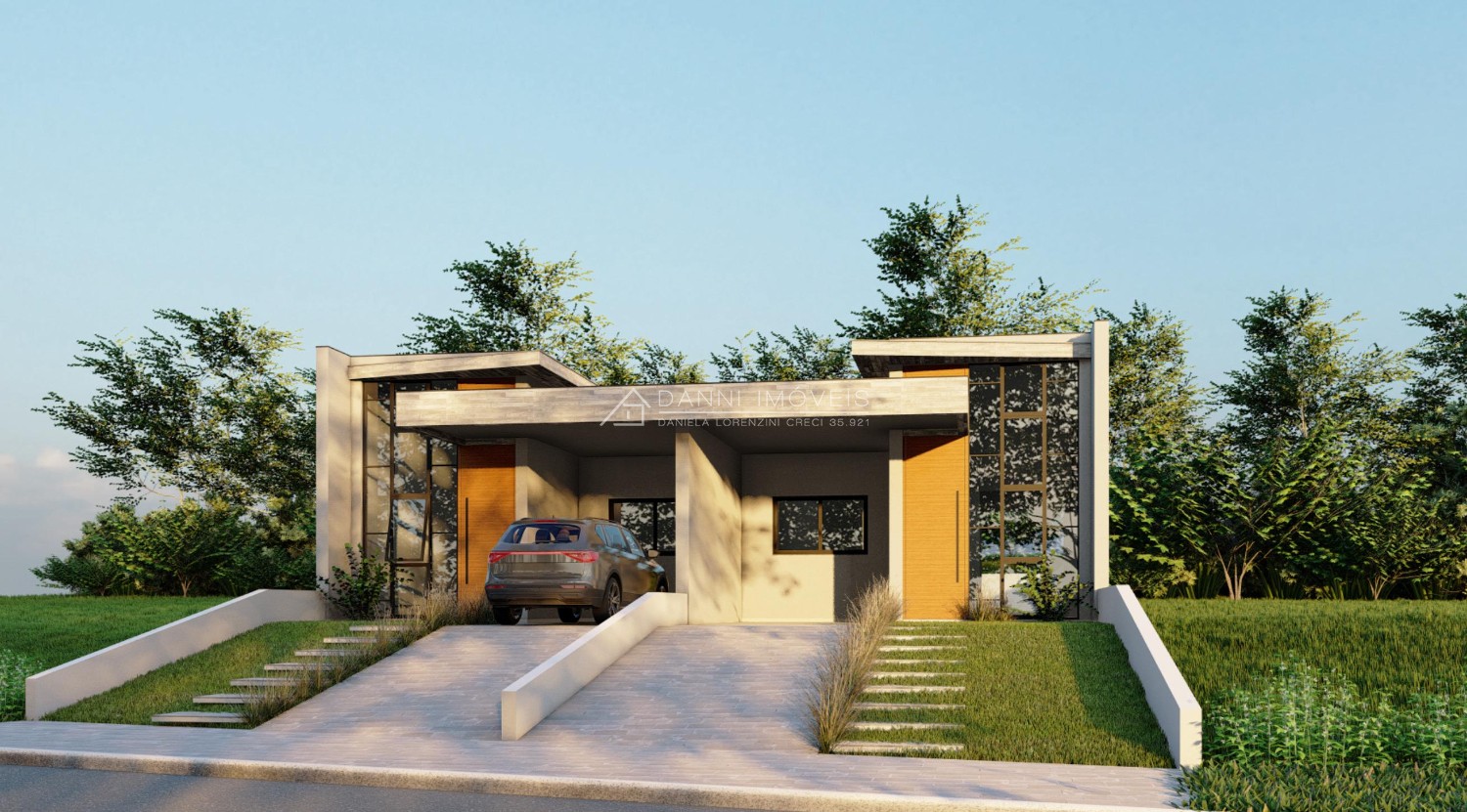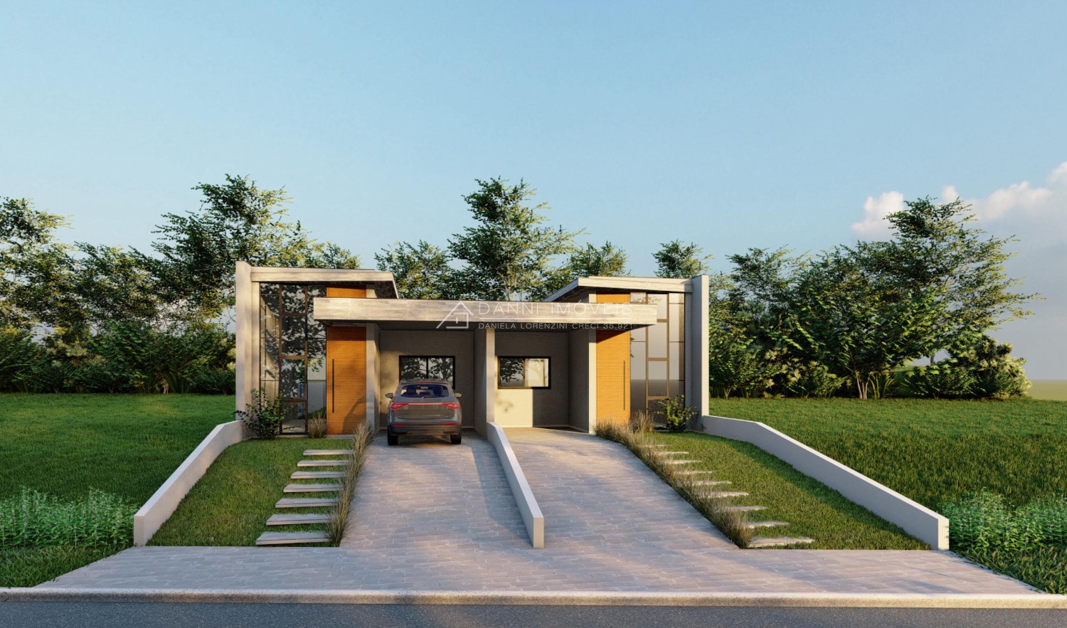Descrição › Casa Geminada com 105,32m2, com 3 dormitórios sendo 1 Suíte, Banheiro Social, Ambientes integrados com pé direito mais alto, pátio na frente e lateral, ótima orientação solar