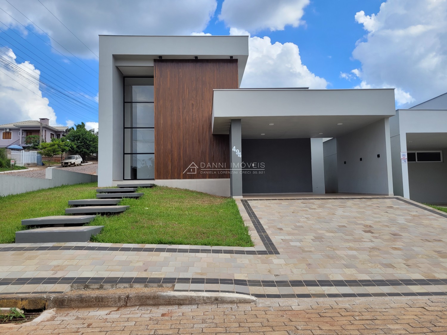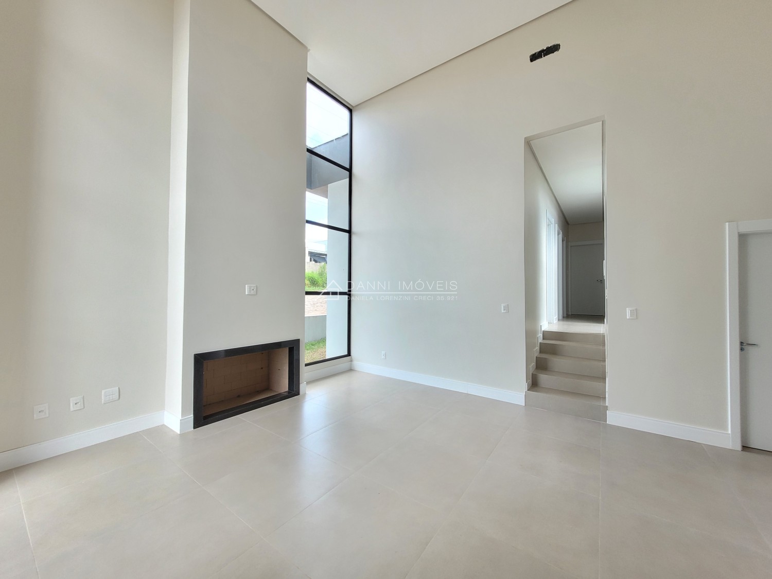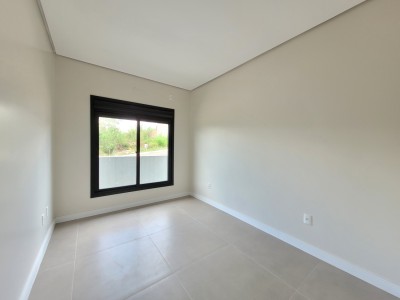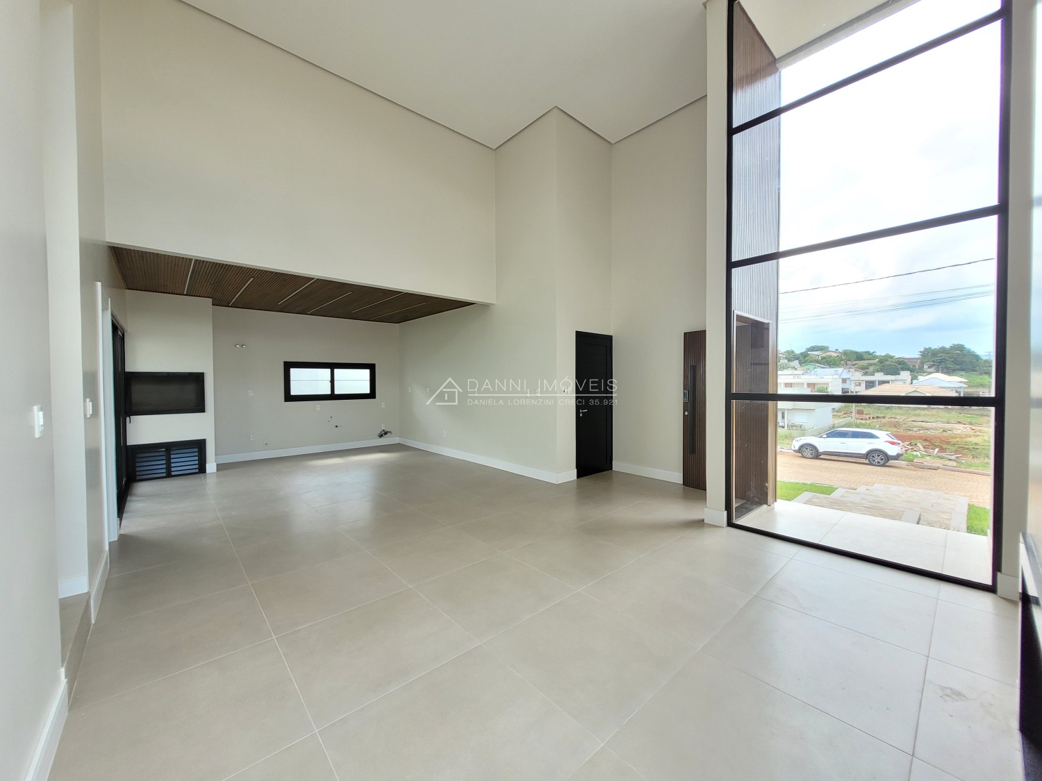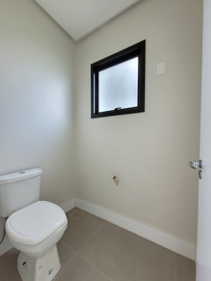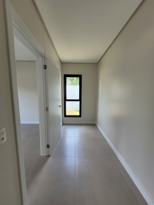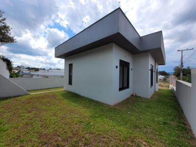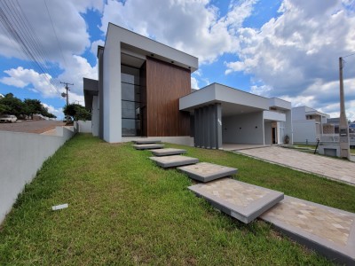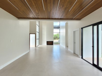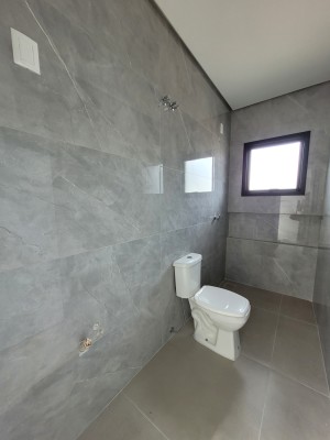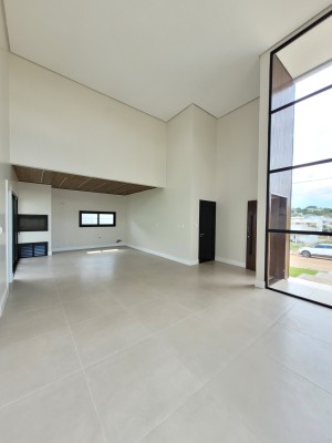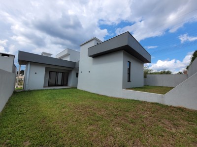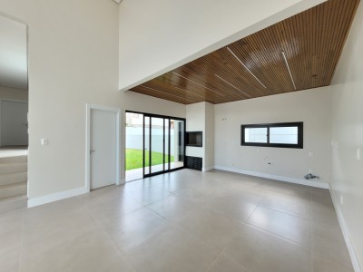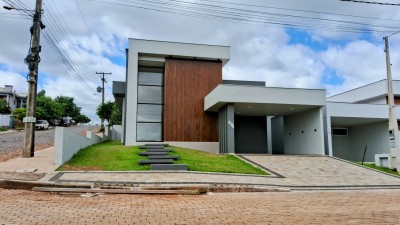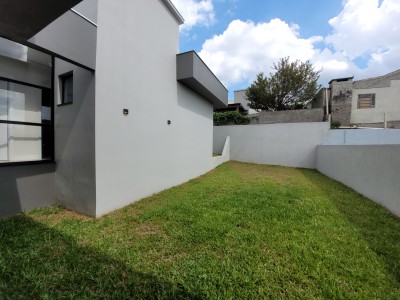 Descrição › Casa moderna de esquina, com 160,44m2, aberturas externas em Alumínio, internas em Laca Branca, 3 quartos sendo 1 suíte com closet, banheiro social, Lavabo, Lareira, Churrasqueira, Área de Serviço, Sala com pé Direito Alto, rebaixo em gesso, Garagem para 2 carros, pátio na frente e nos fundos, espera para água quente e Split