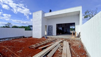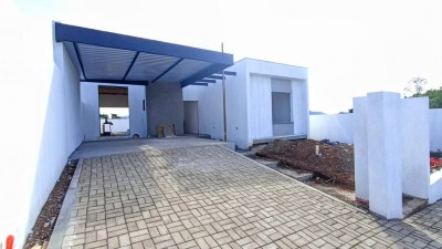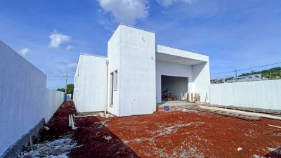 Descrição › Casa Plana, 158,81 m2, 3 dormitórios, 1 suíte, Banheiro Social, ambientes sociais integrados, Varanda, amplo pátio nos fundos, Vaga Coberta para 2 carros, lavanderia separada