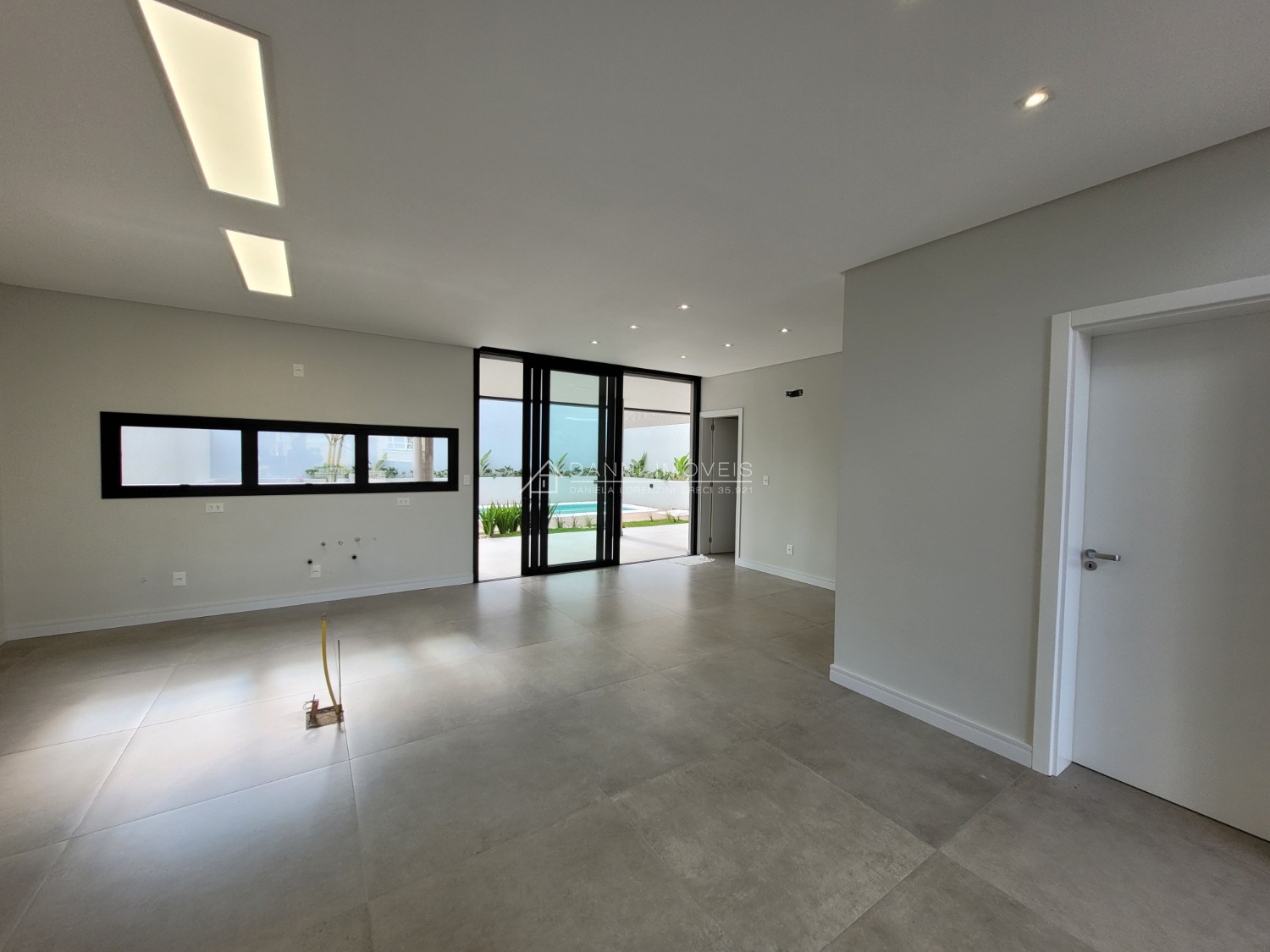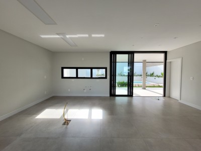 Sala de estar, jantar e cozinha integradas com acesso ao jardim e piscina