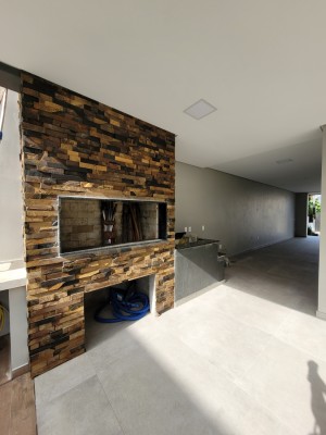 Área gourmet coberta, com churrasqueira, fogão campeiro e jardim integrado