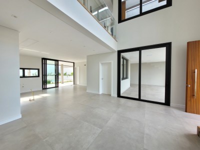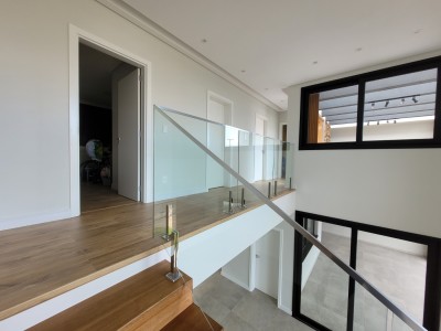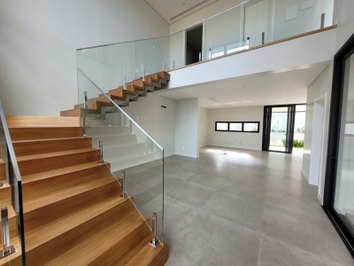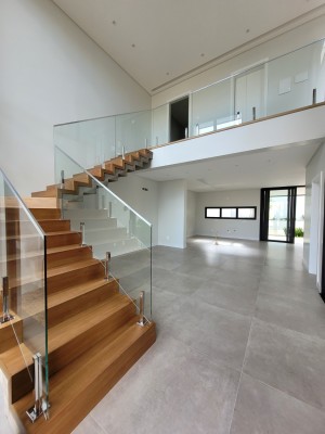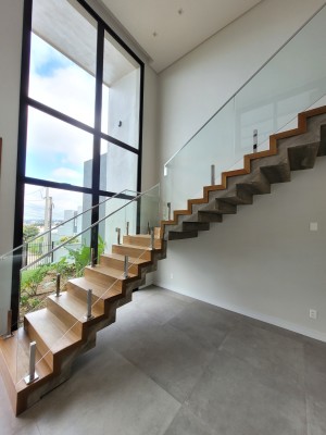 Hall com pé-direito duplo e escada flutuante com guarda-corpo em vidro