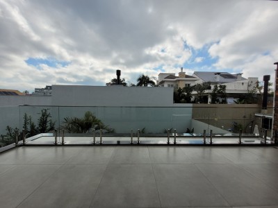 Sacada superior com espaço para festas ou para ambiente familiar, mais íntimo, com vista para a cidade.