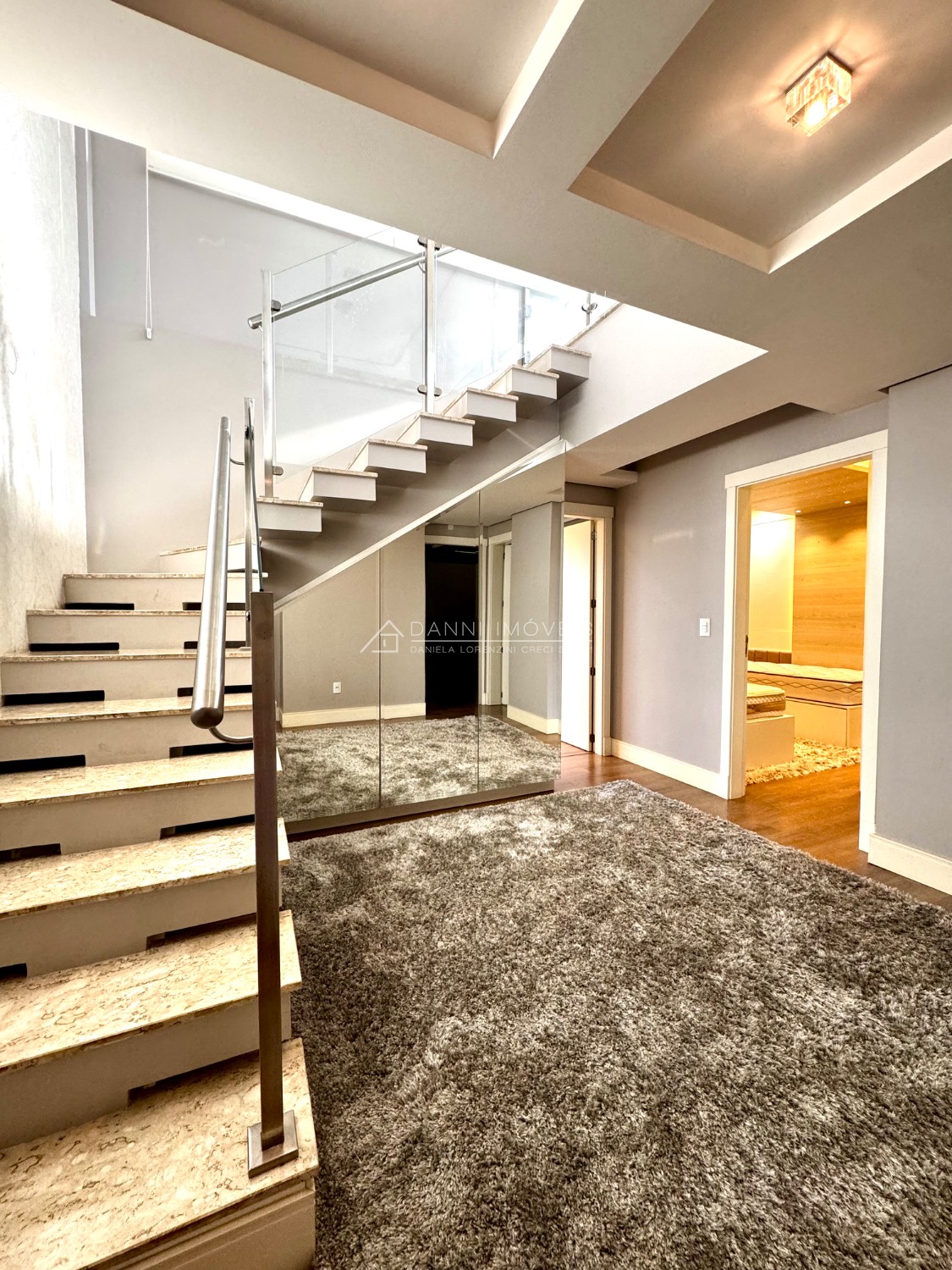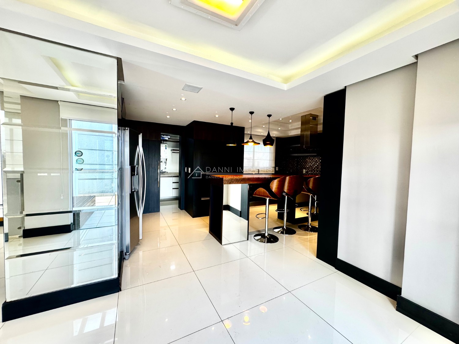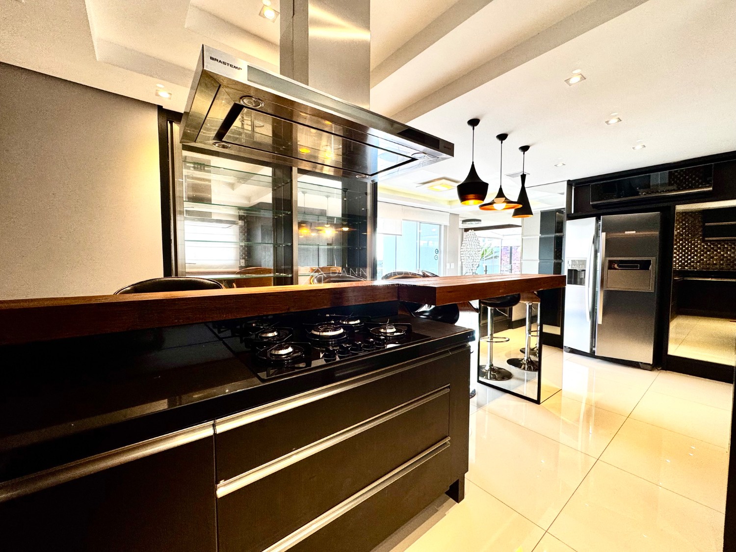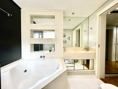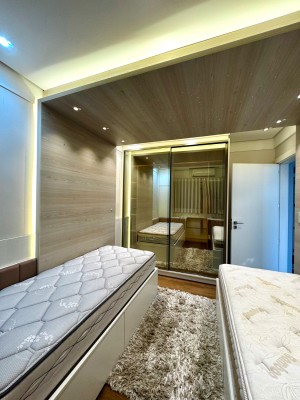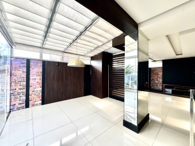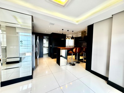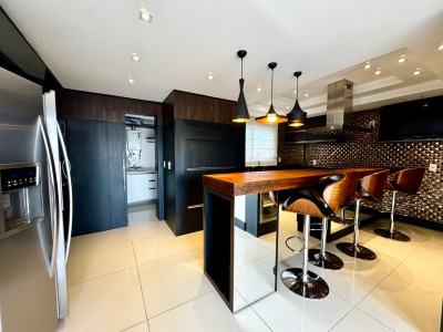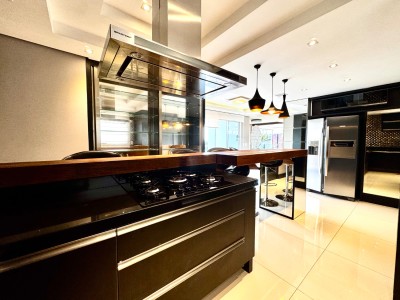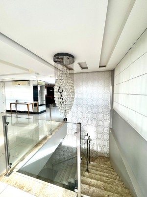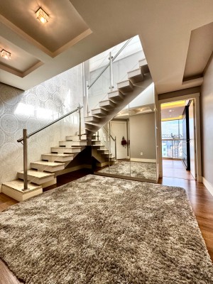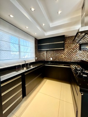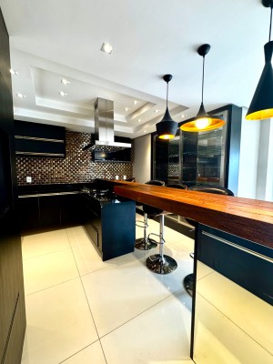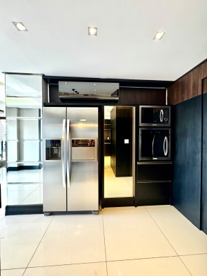 Descrição › Mobiliada conforme fotos. Possui automação completa : som, vídeo, aúdio (inclusive na área da piscina), splits, cortinas do teto do pergolado no segundo andar e persianas do primeiro pavimento, com tecla de desligamento completo e acionamento por celular.
