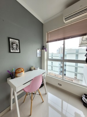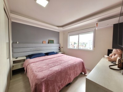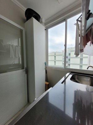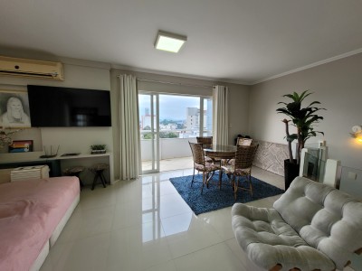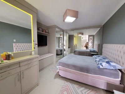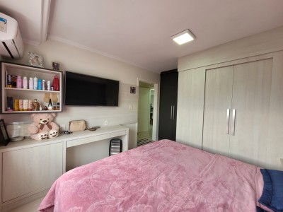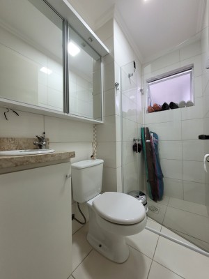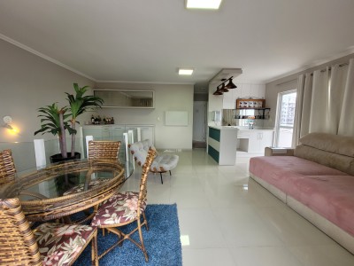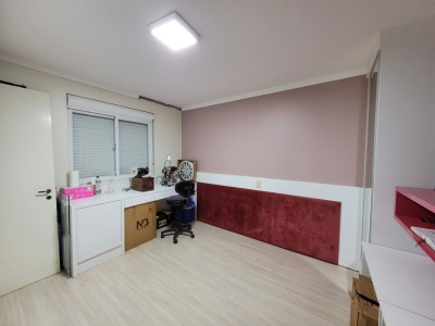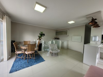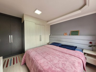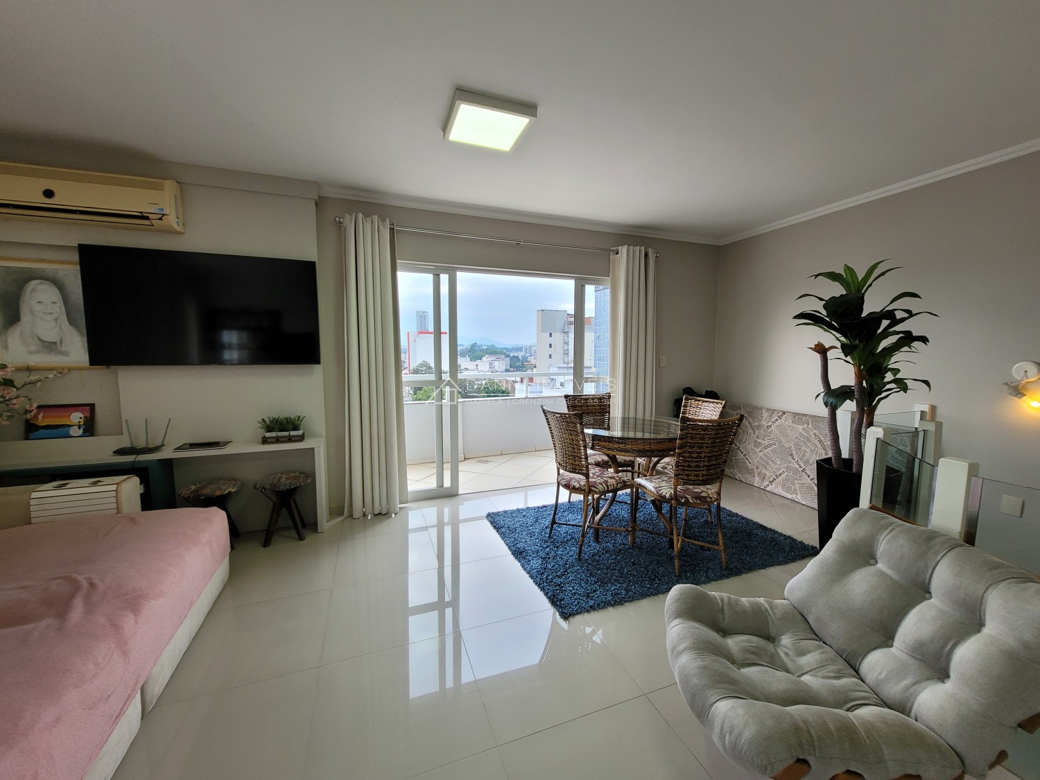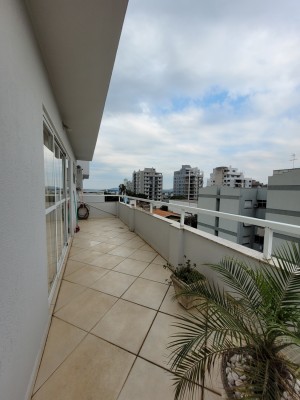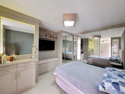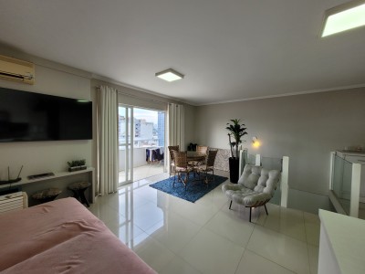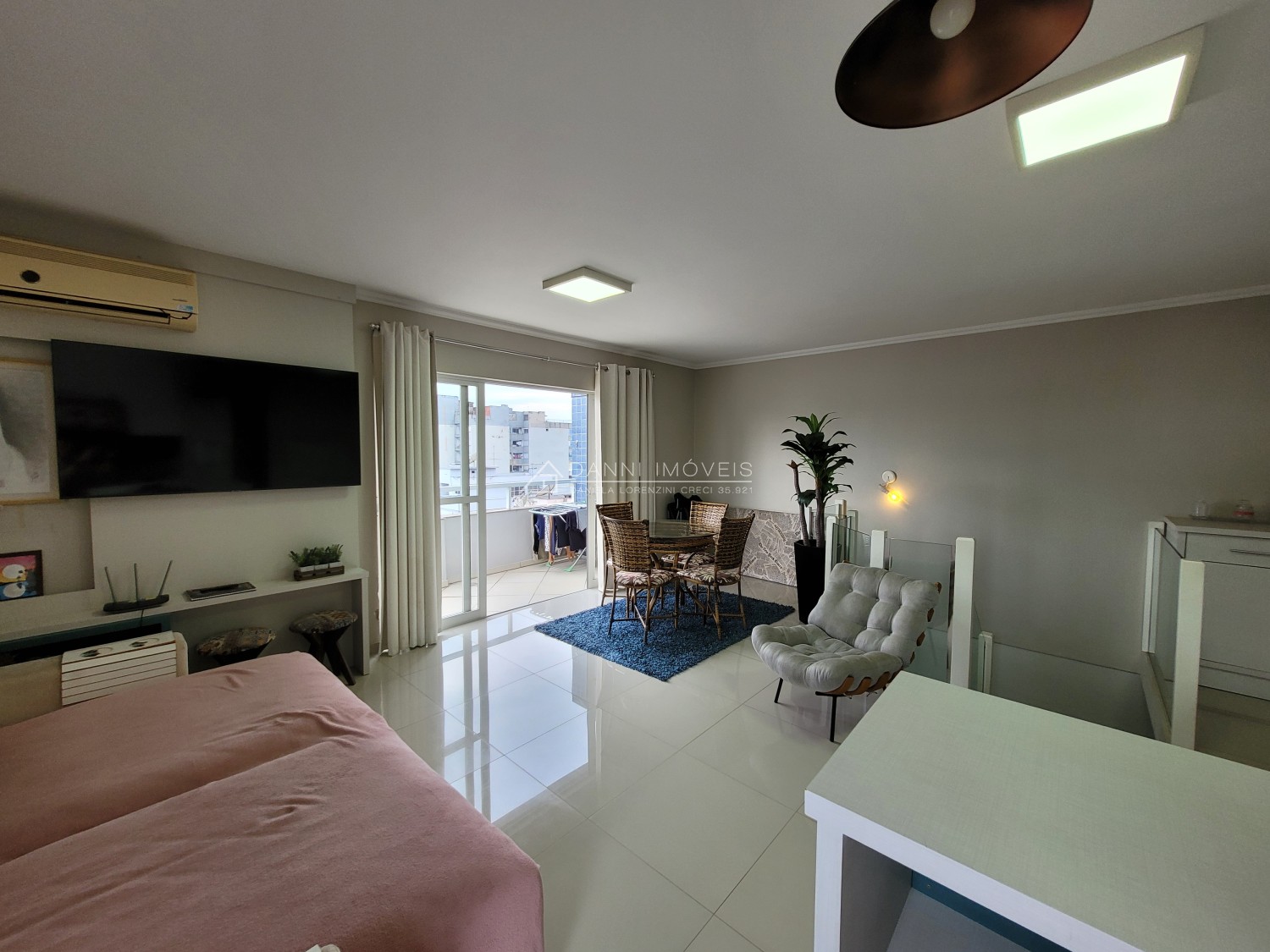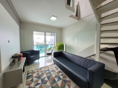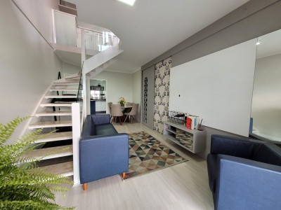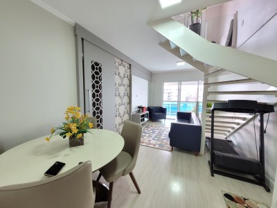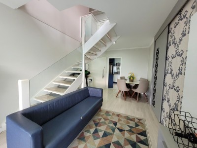 Descrição › Cobertura duplex de fundos, com orientação solar norte/oeste, semi mobiliada (permanecem móveis planejados, splits, cortinas e iluminação).