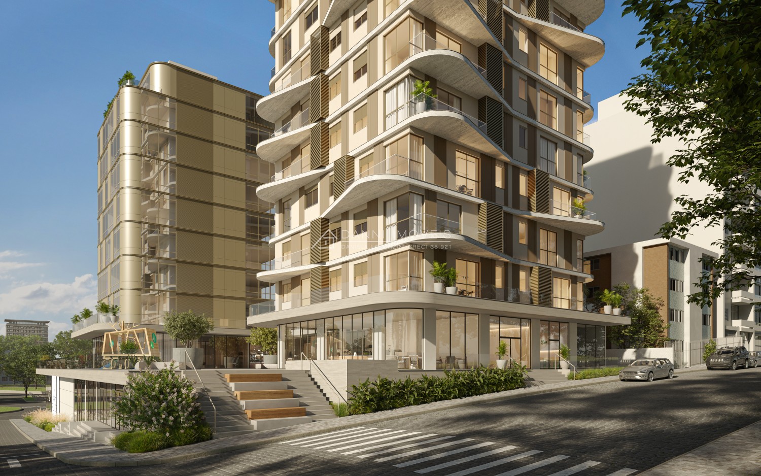 A Torre residencial é composta por unidades sendo 5 por andar, distribuídas entre apartamentos de 2 dormitórios (1 suíte), 2 dormitórios compacto, JK e 2 belas coberturas. A Torre Residencial conta com salão de festas e academia no 4º andar, 2 elevadores e sacadas nos apartamentos (exceto JK). As Torres são unidas por uma ampla Esplanada com lojas e espaços biofílicos, trazendo conforto e comodidades a moradores e clientes. Possui salas e apartamentos no 4º andar com terraço!! Disponível para compra Box de Estacionamento para salas e apartamentos!