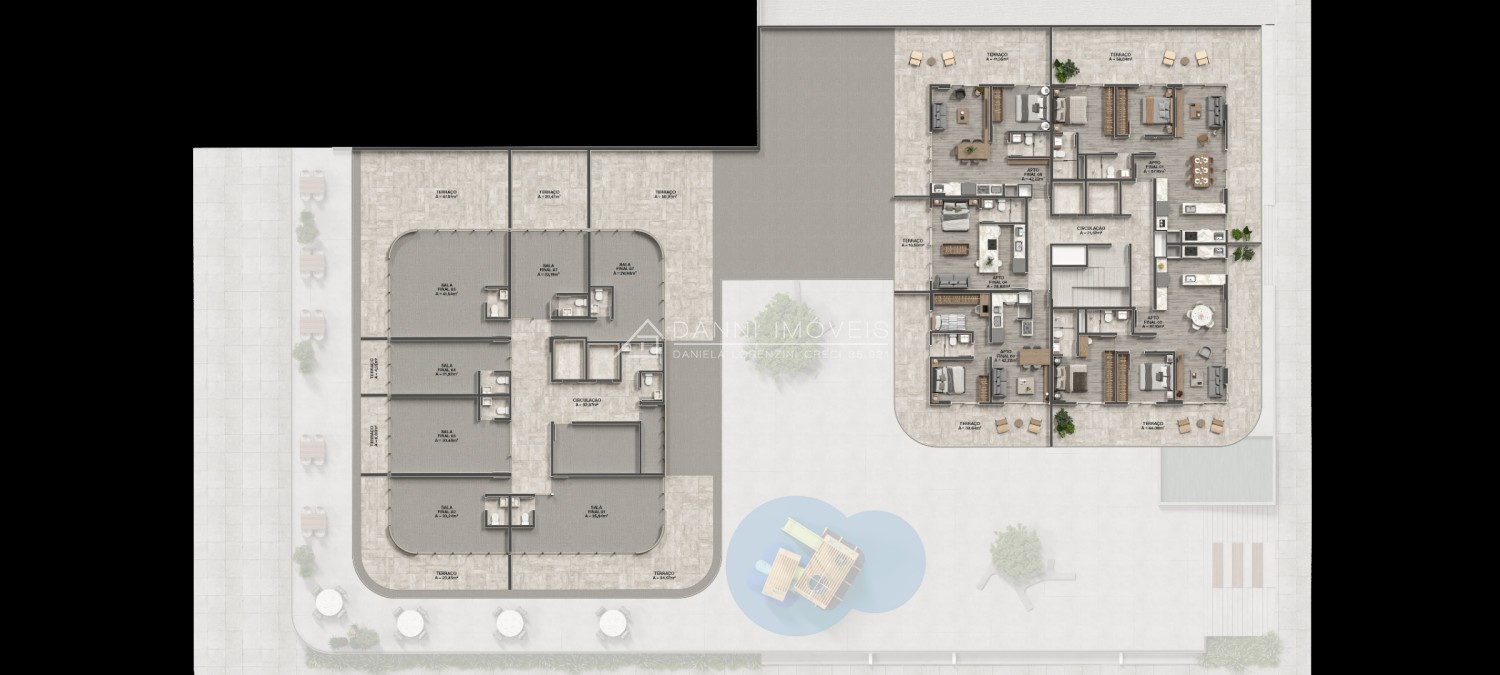 A Torre residencial é composta por unidades sendo 5 por andar, distribuídas entre apartamentos de 2 dormitórios (1 suíte), 2 dormitórios compacto, JK e 2 belas coberturas. A Torre Residencial conta com salão de festas e academia no 4º andar, 2 elevadores e sacadas nos apartamentos (exceto JK). As Torres são unidas por uma ampla Esplanada com lojas e espaços biofílicos, trazendo conforto e comodidades a moradores e clientes. Possui salas e apartamentos no 4º andar com terraço!! Disponível para compra Box de Estacionamento para salas e apartamentos!