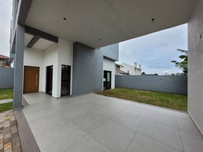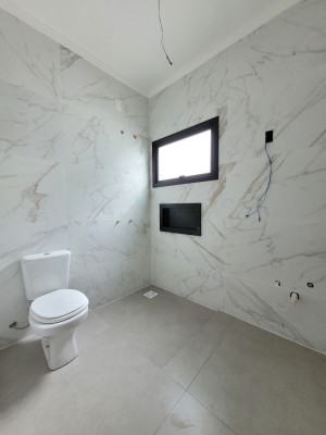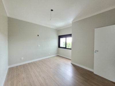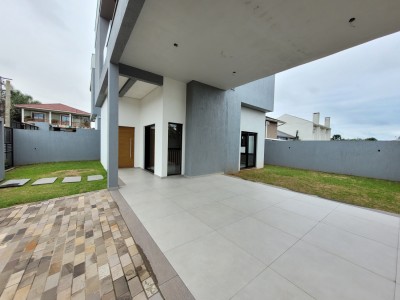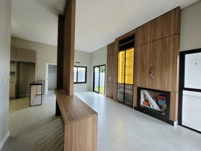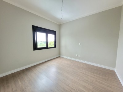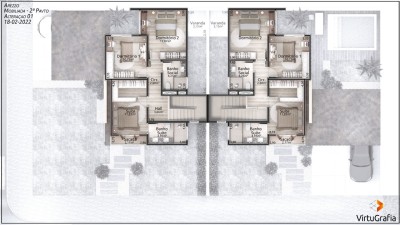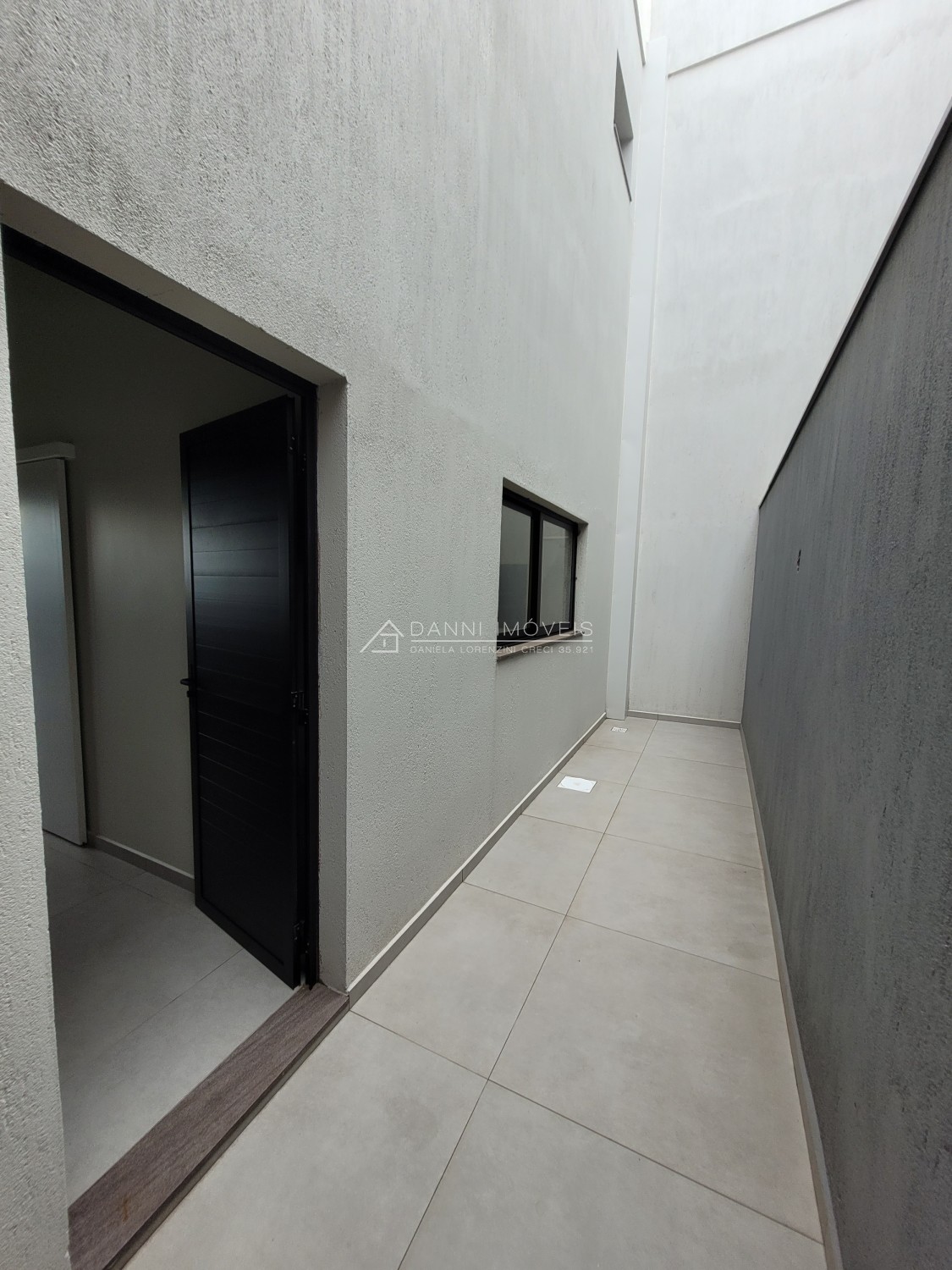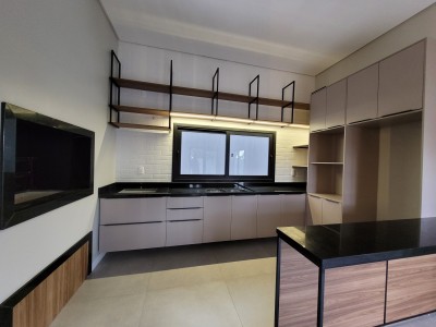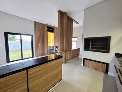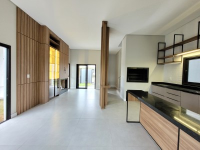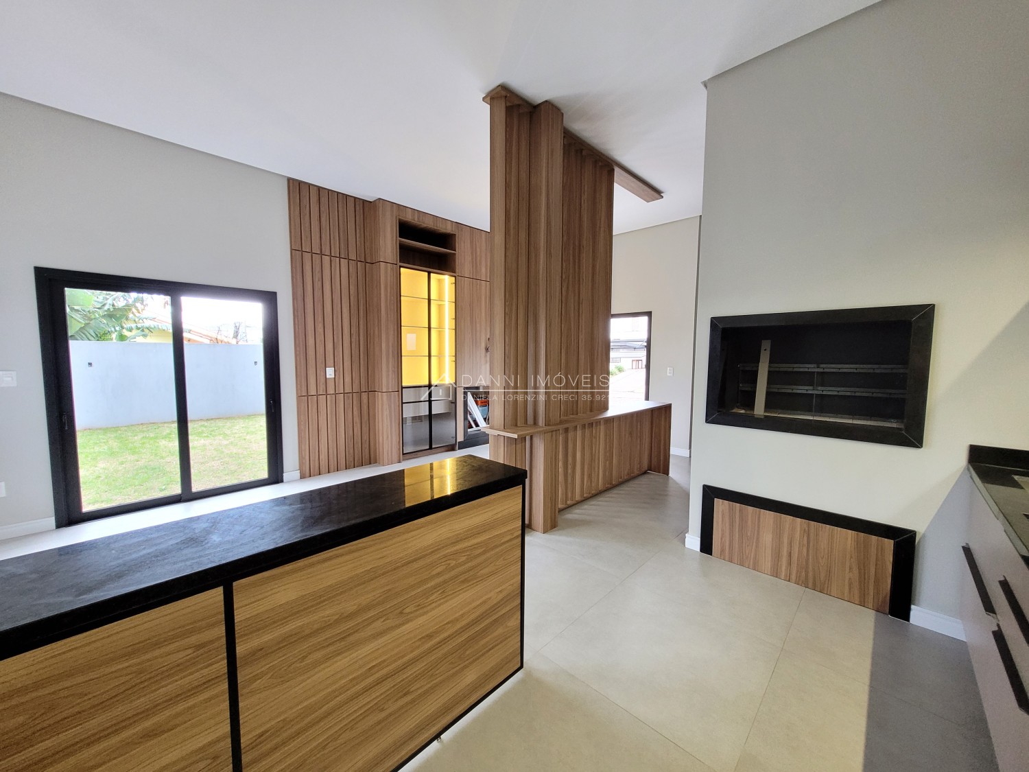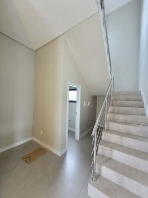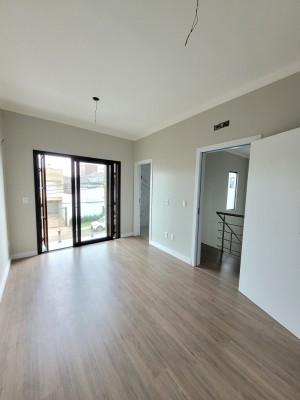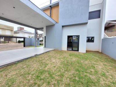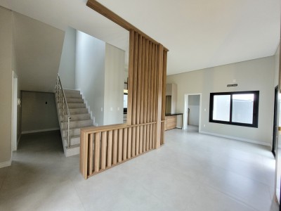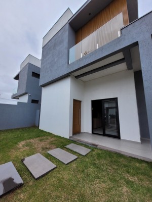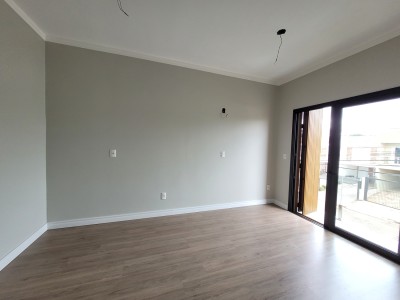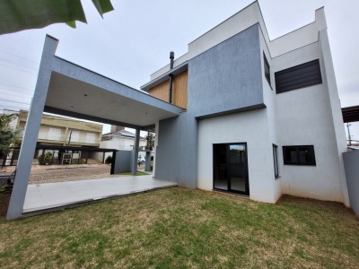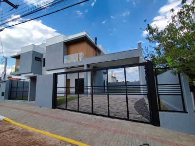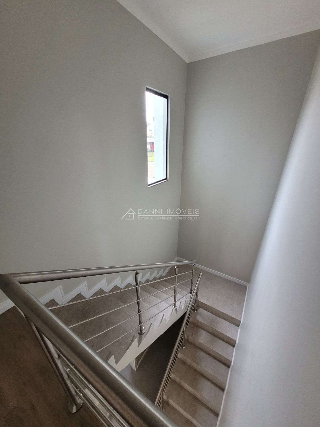 Descrição › Sobrado com 164m2, no residencial Arezzo no Bairro Universitário, Três dormitórios, sendo uma suíte, massa corrida, esquadrias em alumínio preto, corrimão da escada interna em aço inox, espera para split nos quartos e sala, espera para piscina, água quente, espera para gás, todo murado e gradeado, rebaixo em gesso no pavimento inferior e roda forro em gesso no pavimento superior, Lareira e Churrasqueira, são duas unidades com a mesma metragem