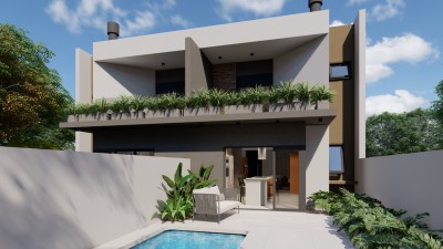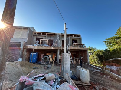 Descrição › Sobrado de 3 dormitórios com suíte, living amplo, pátio frente e fundos. Entregue cercado e murado com vaga para dois carros. Início das obras em setembro de 2024 com entrega prevista para dezembro de 2025 (mais documentação)