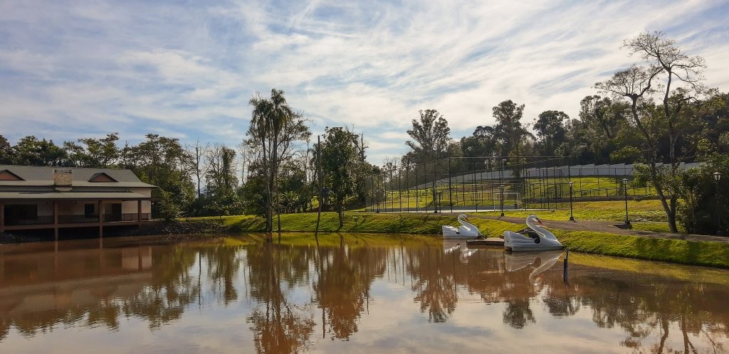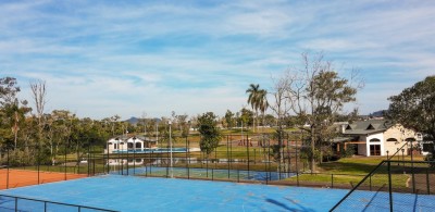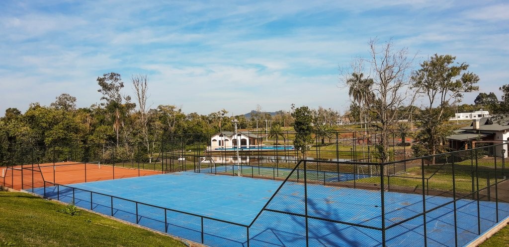 Descrição › Quadras de tênis, Quadras de padel, Quadras de futebol 7, Quadra Poliesportiva, Piscina Adulto e Infantil, Salão de festas mobiliado, Brinquedoteca, Sala de Jogos, Espaço Cinema, Espaço fitness com Academia, Sala de Massagem e Sauna, Trilha de Caminhada, Heliponto, Pomar, Horta e Quiosque com churrasqueira. Guarita com segurança 24 hrs, Condominio estimado em R$ 300,00 mensais. Lotes com metragem mínima de 450,00 m²